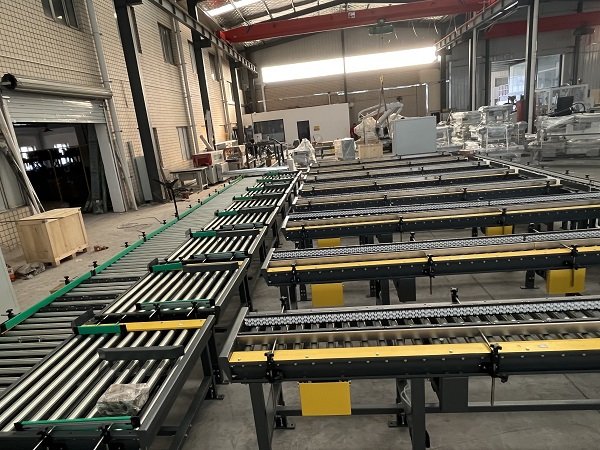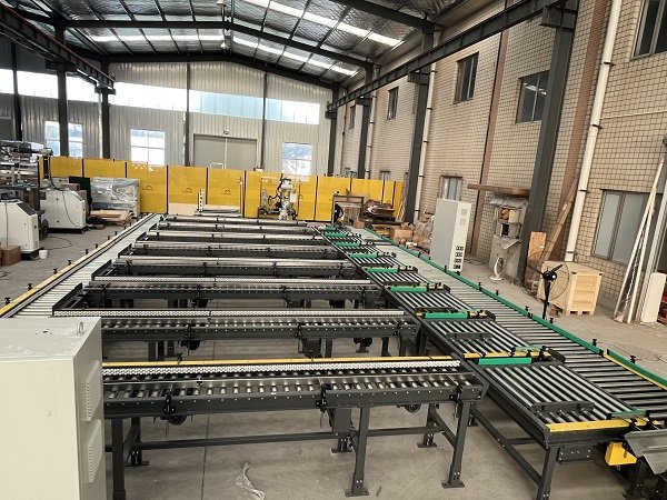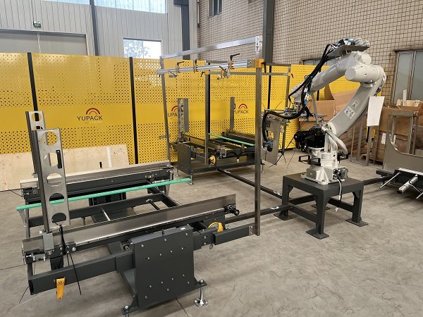 該線體主要功能是對卡丁車和賽車輪胎進行裝箱和碼垛。線體最大亮點是,客戶一共有8條產(chǎn)線4種紙箱尺寸同時混產(chǎn),針對客戶的現(xiàn)實情況,艾訊采用了機器人+動力料倉+自適應折底封底機的結(jié)構(gòu),通過信號交互,來確定取哪款紙箱,開哪款紙箱,再通過信號識別,將紙箱輸送到指定的裝箱工位。同時該線體還配備了實時貼標加在線打印功能,通過和上位機的實時通訊,來確定紙箱需要打印的標簽內(nèi)容。