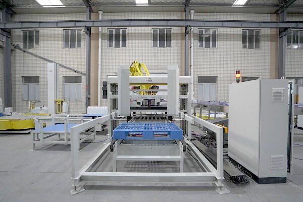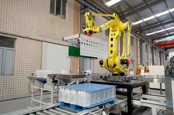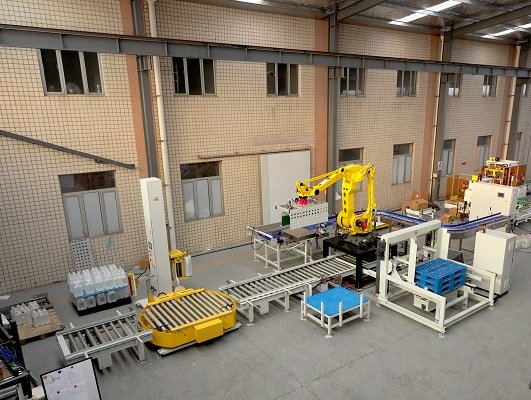 膜包水碼垛纏繞包裝線是由供棧機、理料線、碼垛機器人、墊板倉以及在線纏繞機等設備組成。該線體常用于礦泉水、飲料、啤酒、瓶裝調(diào)味料等產(chǎn)品碼垛使用。鑒于前端罐裝產(chǎn)品的效率比較高,碼垛機器人采用庫卡大負載機器人,同時配以復合式抓手,即可實現(xiàn)一列產(chǎn)品一起抓取,也可以同時抓取墊板,占地面積小,成本低。